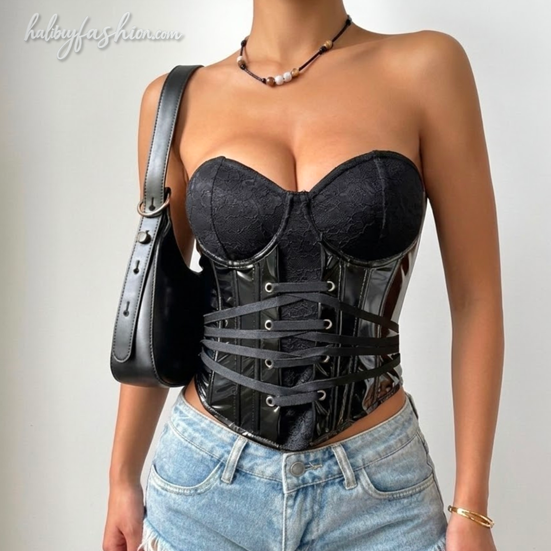 Lace up PU leather patchwork tank top | Festival Outfits Women-final-sale