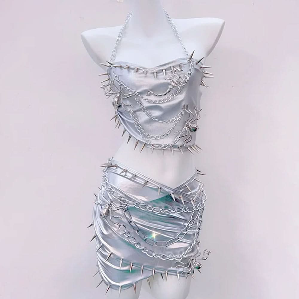 Metal chain halter rivet applique metallic mini skirt set | Festival Outfits Women