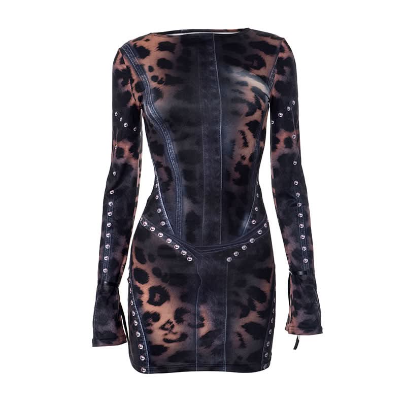 Long sleeve leopard print crewneck mini dress | Festival Outfits Women | Leopard Print Mini Dress