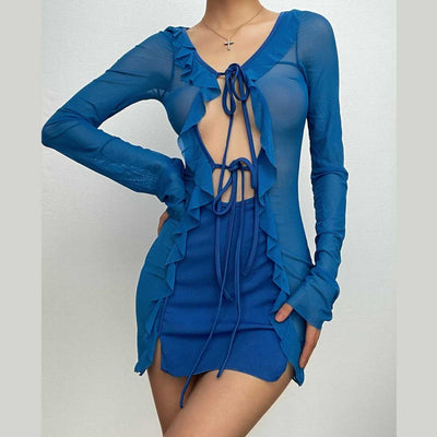 Gloves mesh corset off shoulder hollow out long sleeve halter cut out mini dress