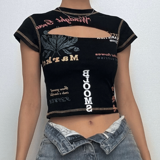 Contrast print short sleeve stitch hollow out crewneck crop cut out top | Festival Outfits Women