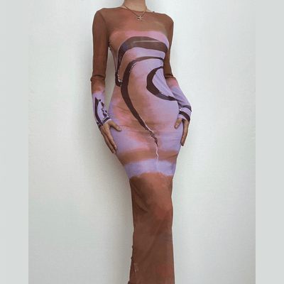 Sheer mesh see through abstract long sleeve high neck maxi dress