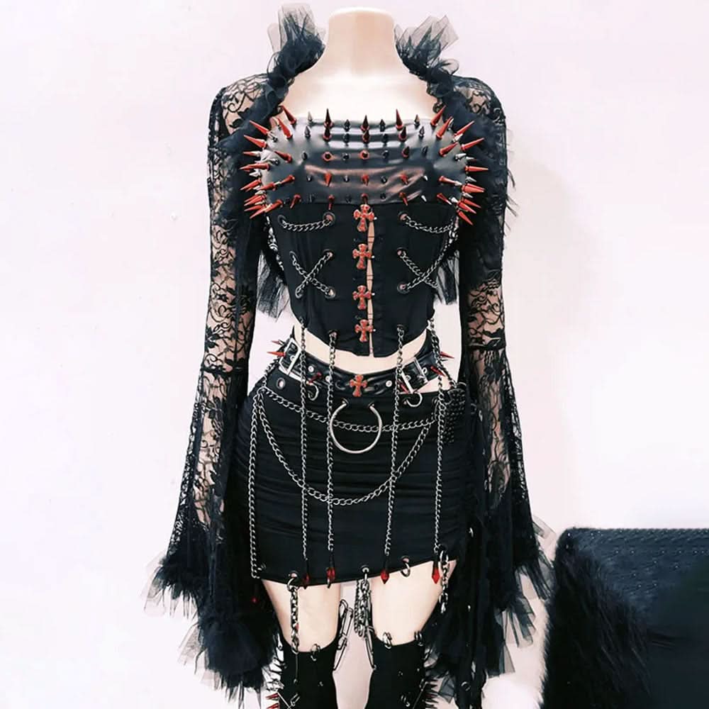 Long sleeve metal chain rivet applique mini skirt set | Festival Outfits Women
