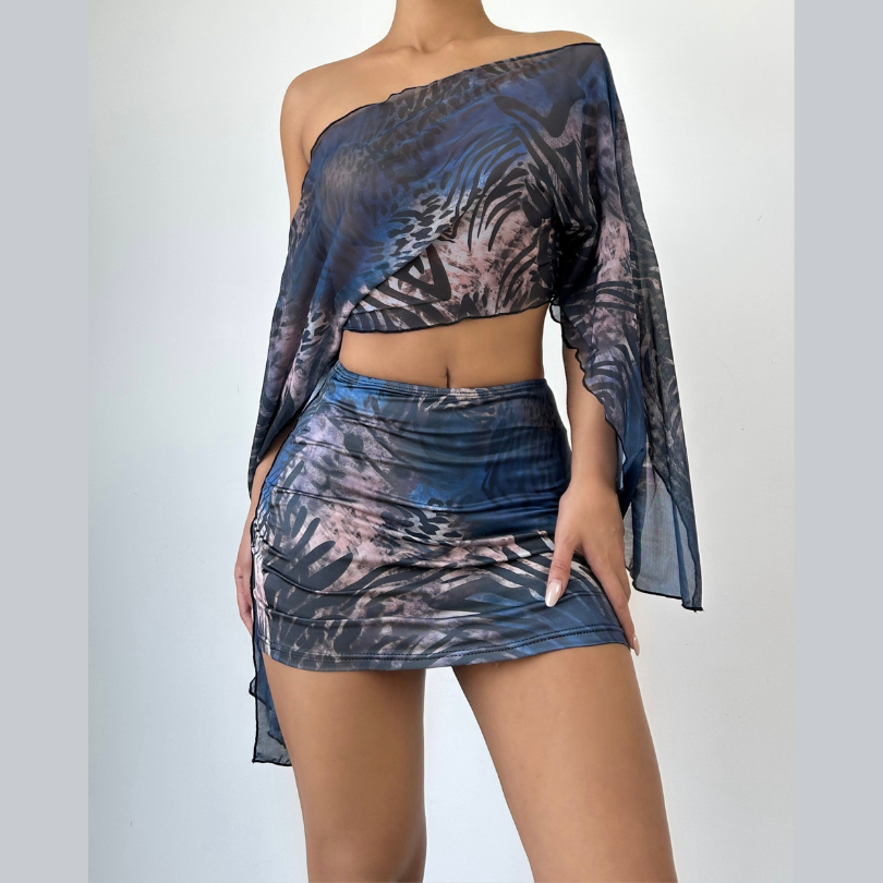 Mesh long sleeve off shoulder print mini skirt set | Festival Outfits Women