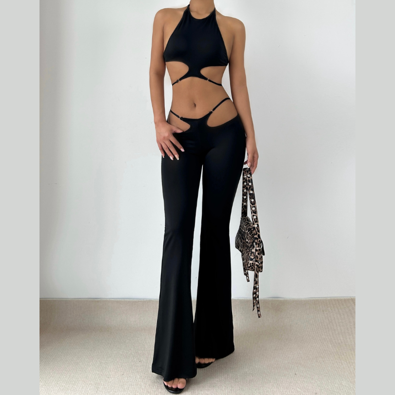 Halter hollow out solid backless pant set | Festival Outfits Women