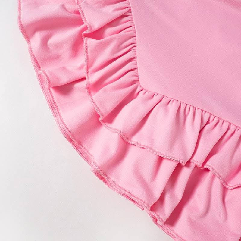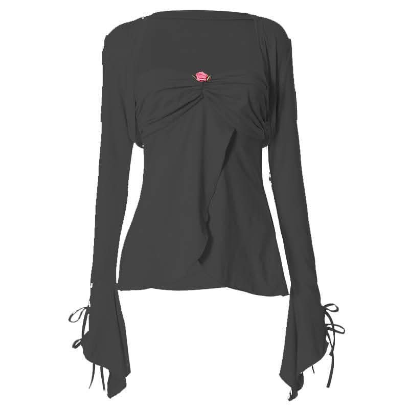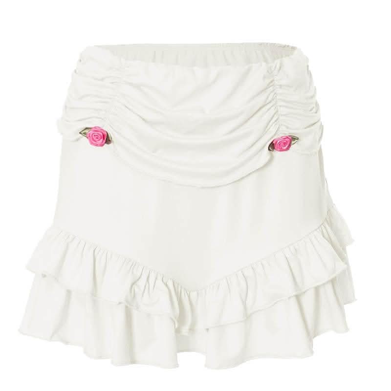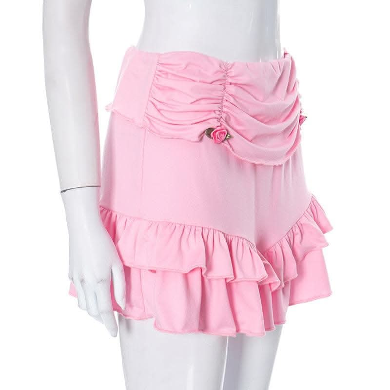 Long sleeve self tie ruched flower applique ruffle solid mini skirt set-final-sale