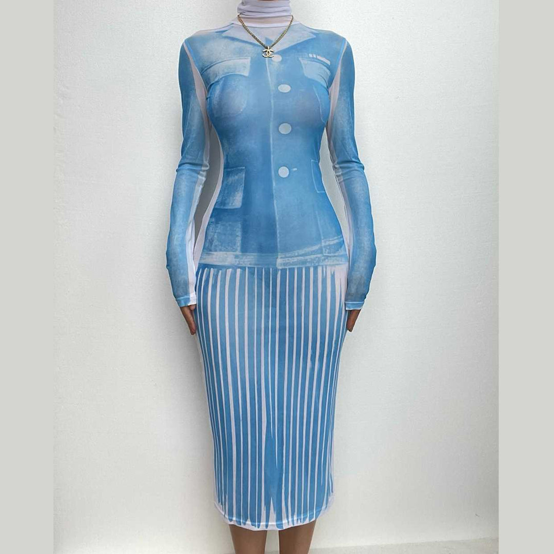 Sheer mesh see through turtle neck long sleeve contrast print midi dress