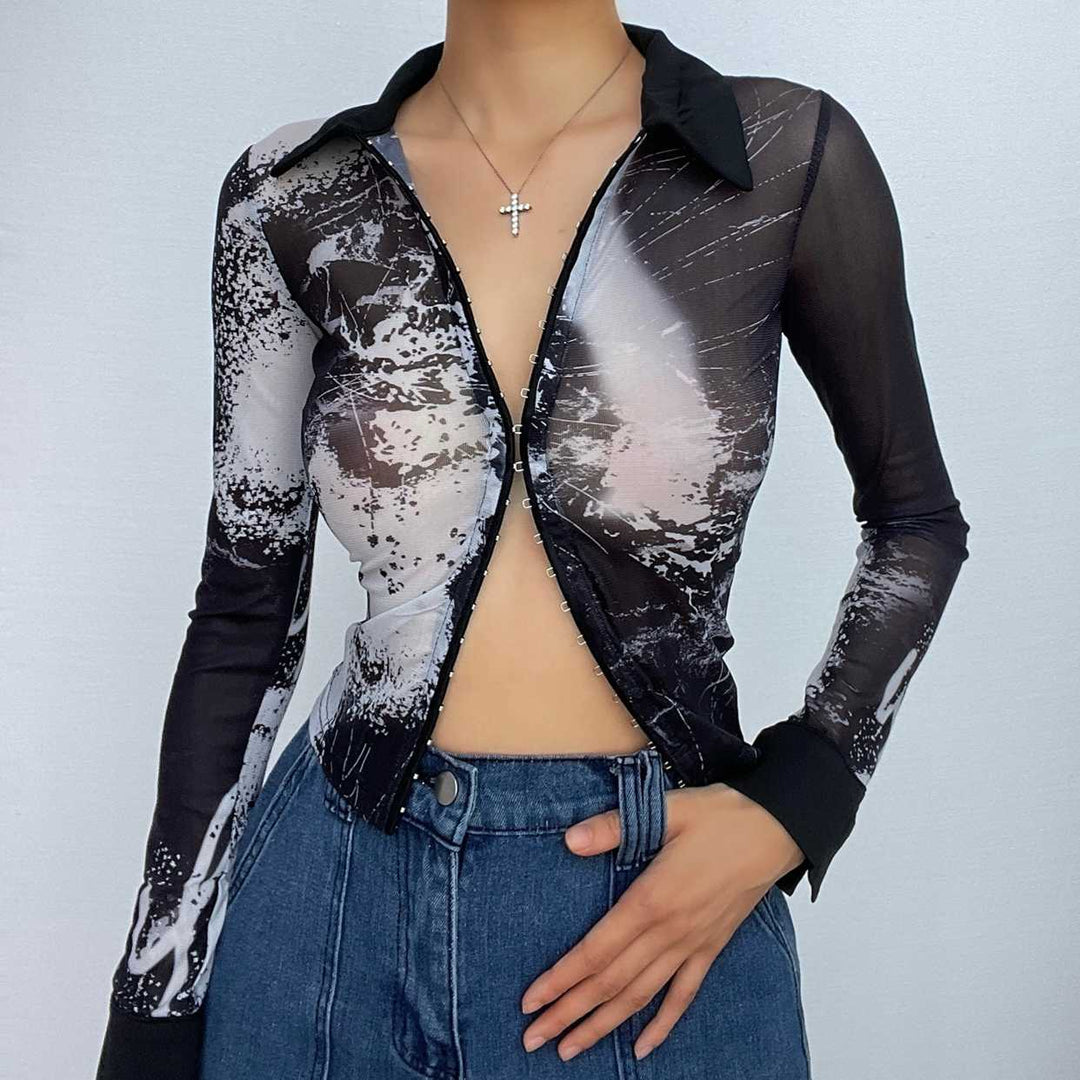Sheer mesh see through solid long sleeve gloves print high neck top