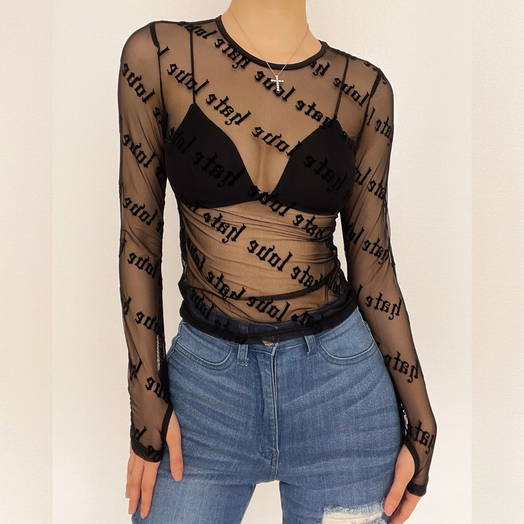 Sheer mesh "hate love" print see through solid long sleeve gloves top