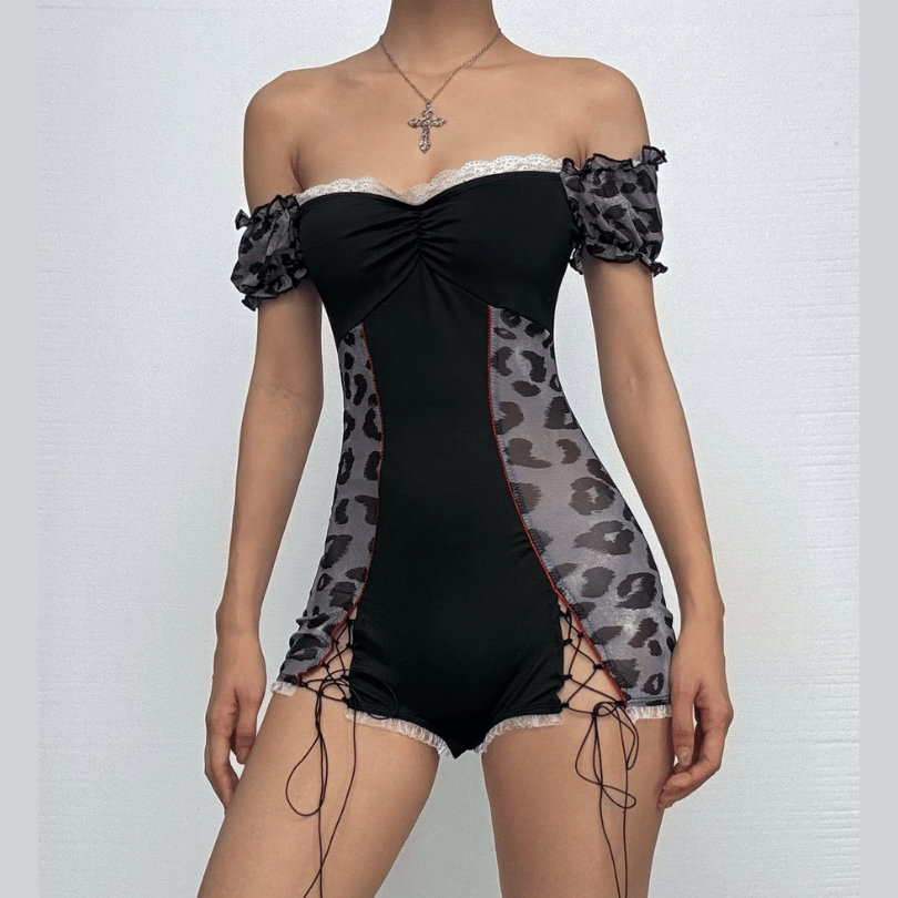 Short puff sleeve leopard print lace hem romper | Festival Outfits Women