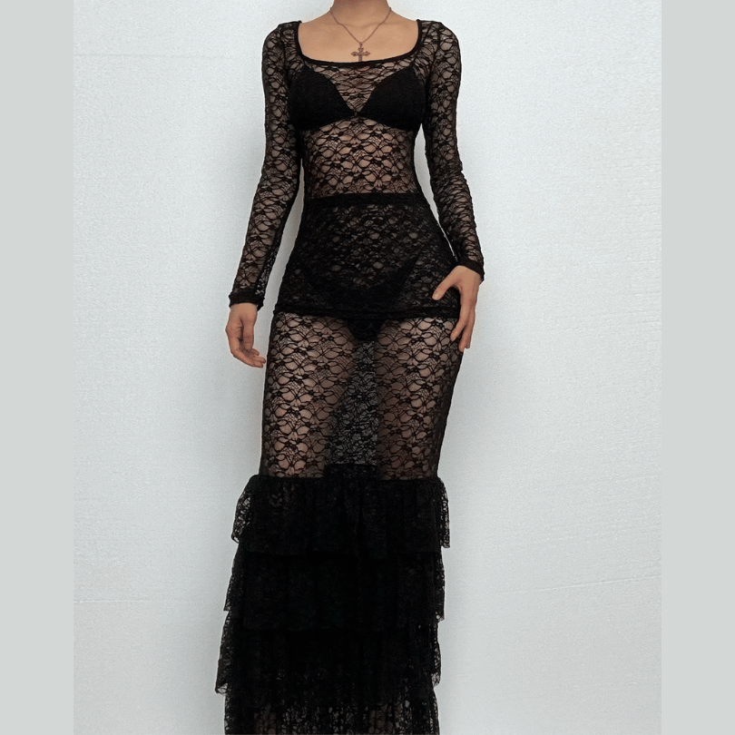 Long sleeve lace see through ruffle maxi skirt set | Festival Outfits Women