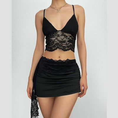 Off shoulder self tie flower applique zip-up button mini skirt set