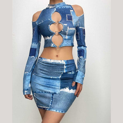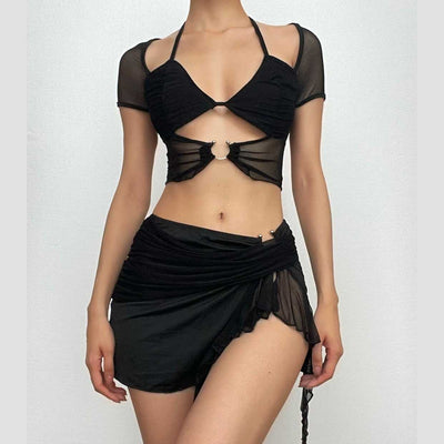 Flared sleeve tie dye o ring self tie halter low cut mini skirt set