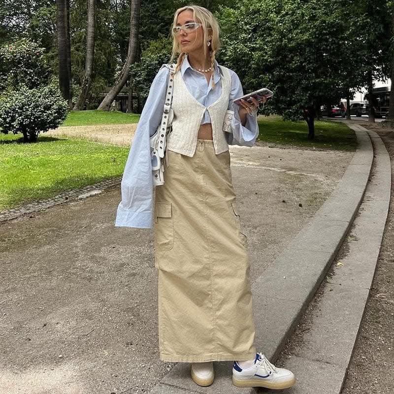 Ruched solid zip-up slit cargo maxi skirt Parachute pants
