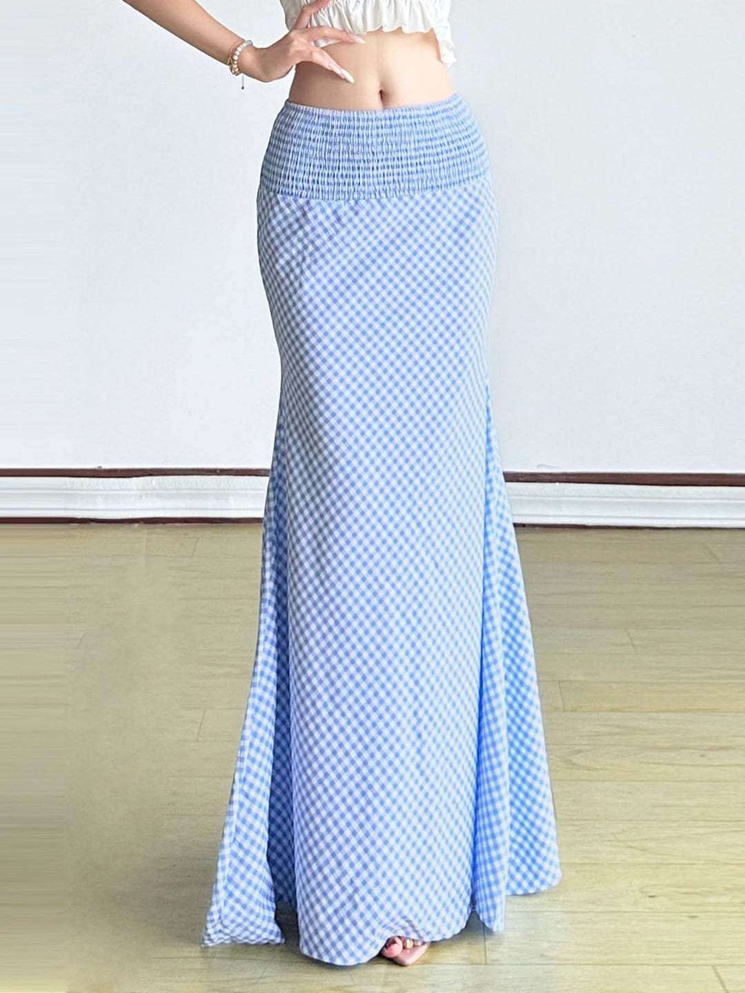 Plaid smocked zip-up contrast maxi skirt | Festival Outfits Women
