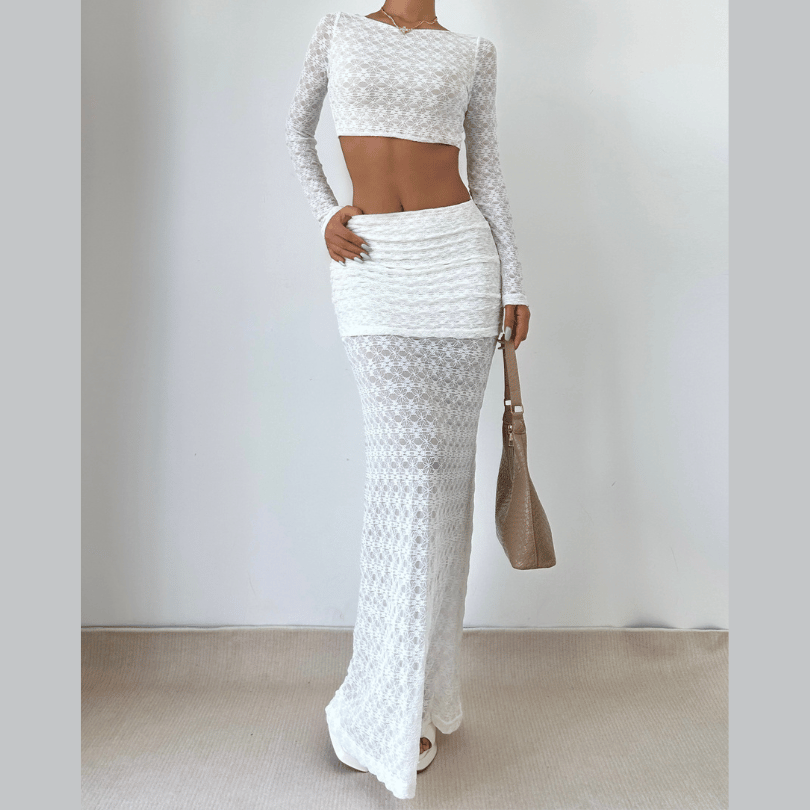 Long sleeve lace crewneck crop maxi skirt set | Festival Outfits Women