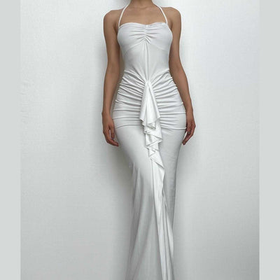 Halter solid irregular sleeveless backless self tie slit maxi dress