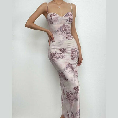 Leopard print contrast spaghetti strap u neck backless midi dress