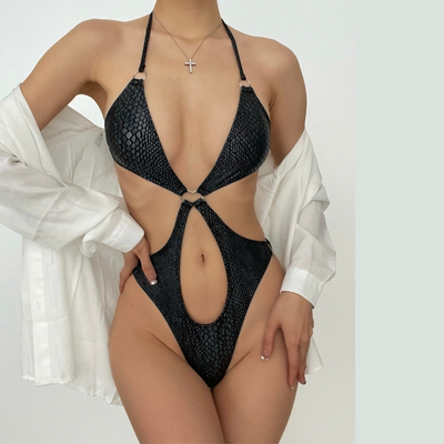 Snakeskin metallic halter o ring self tie mini skirt 3 piece swimwear