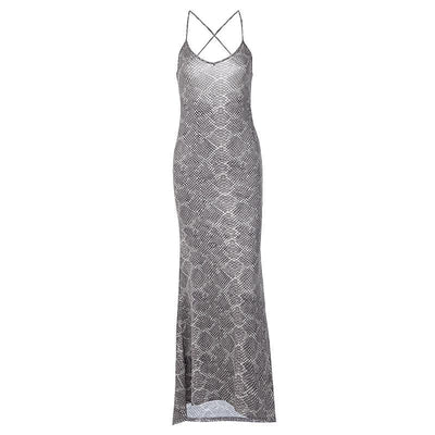 Halibuy Cowl neck open back snake print slit sheer maxi dress