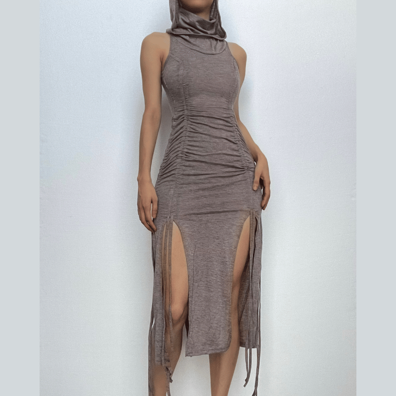 Drawstring hoodie sleeveless solid slit high neck midi dress