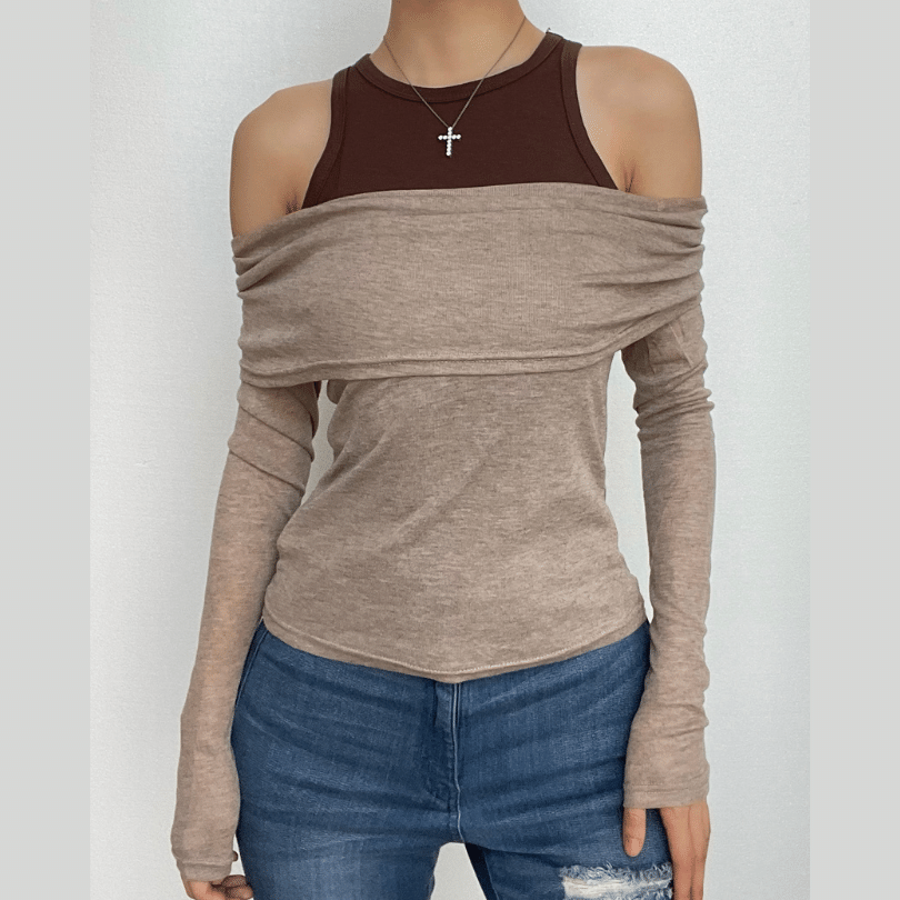 Contrast long sleeve 2-way off shoulder 2 piece top