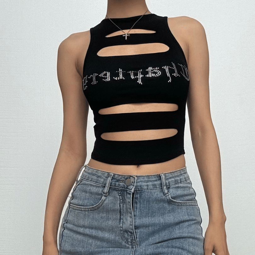 Sleeveless crewneck hollow out beaded contrast crop cut out top