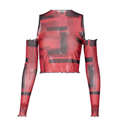 Hollow out mesh patchwork long sleeve contrast bodysuit