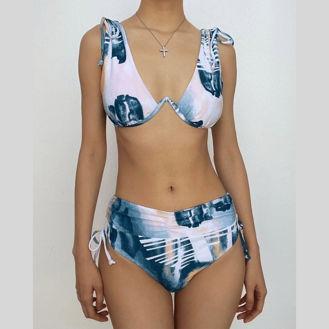 Drawstring contrast print padded halter backless 3 piece swimwear