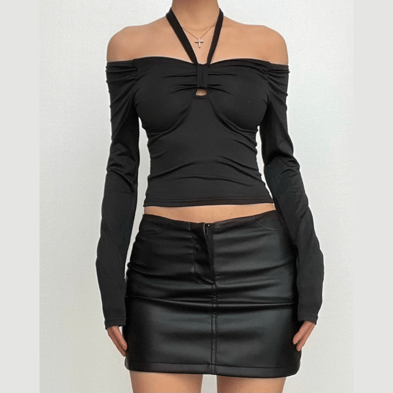 Long sleeve off shoulder halter ruched backless solid hollow out cut out top | Festival Outfits Women