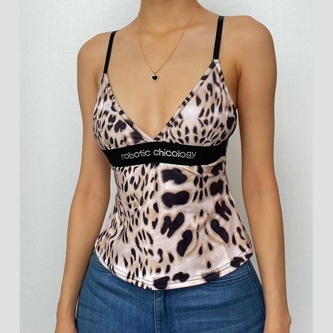 Leopard print beaded patchwork v neck backless cami top | Cheetah Print Top