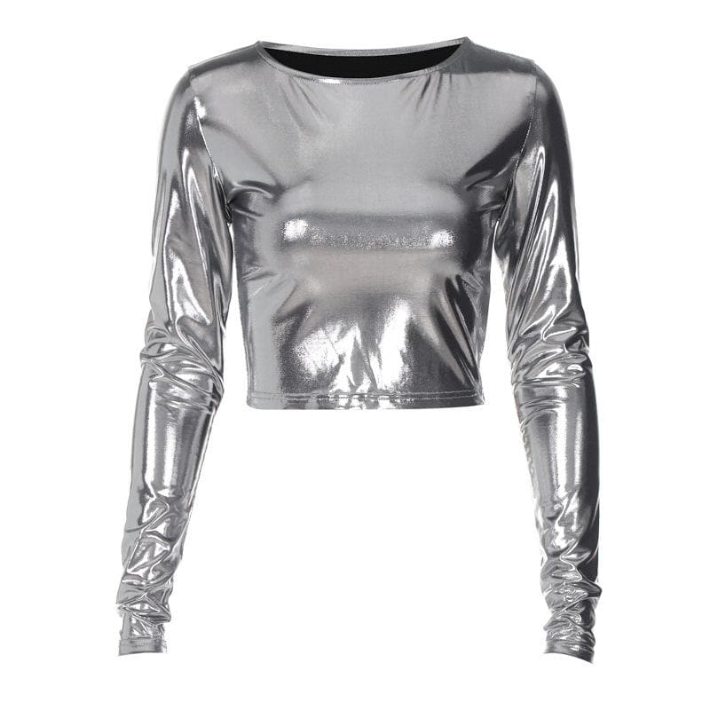 Long sleeve crewneck metallic solid crop top | Festival Outfits Women