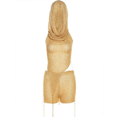 Sleeveless hoodie low cut slit self tie turtle neck see through maxi dress