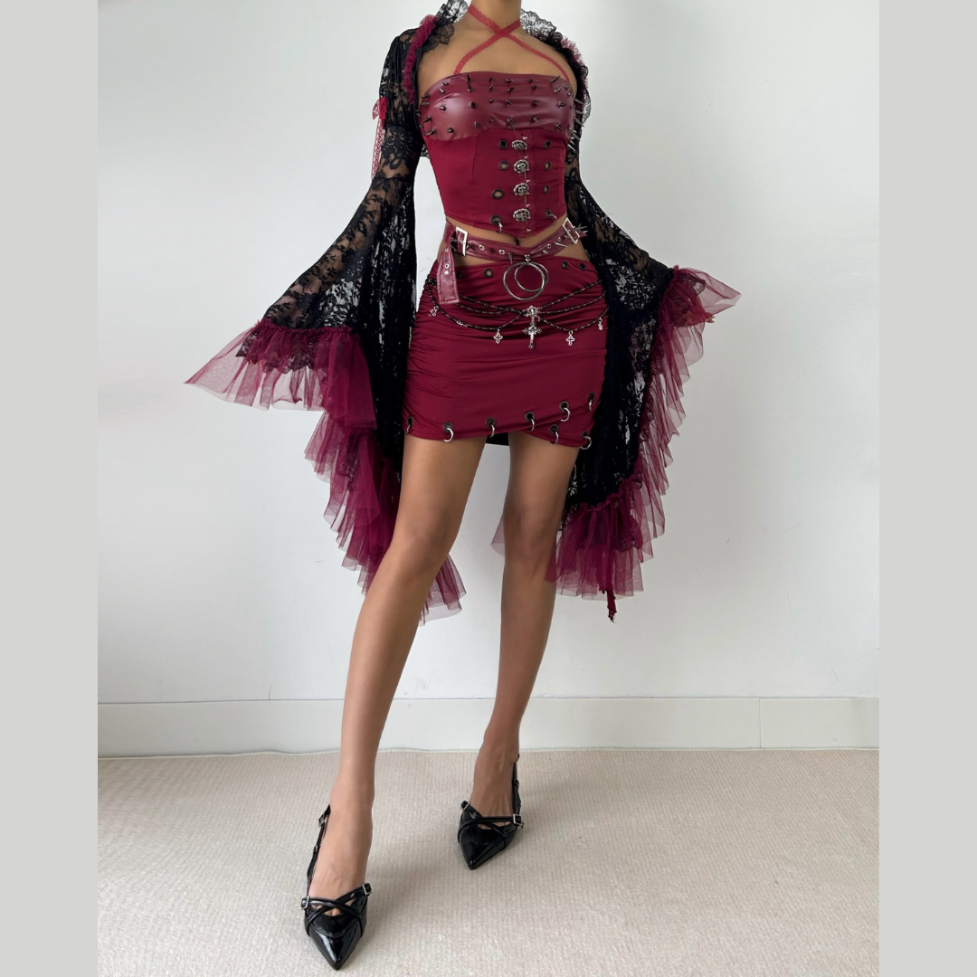 Rivet metal chain lace PU leather beaded shrug 3 piece mini skirt set Cargo Mini Skirt | Festival Outfits Women