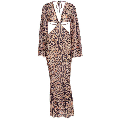 V neck leopard print long sleeve hollow out cut out maxi dress