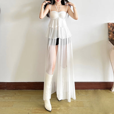 Hollow out ruched mesh tube cut out maxi dress