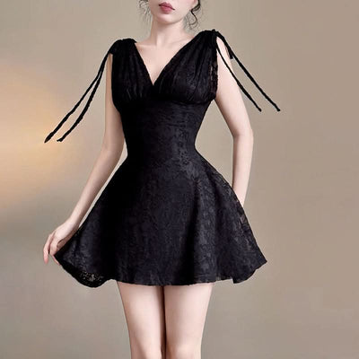 Self tie v neck lace solid mini dress