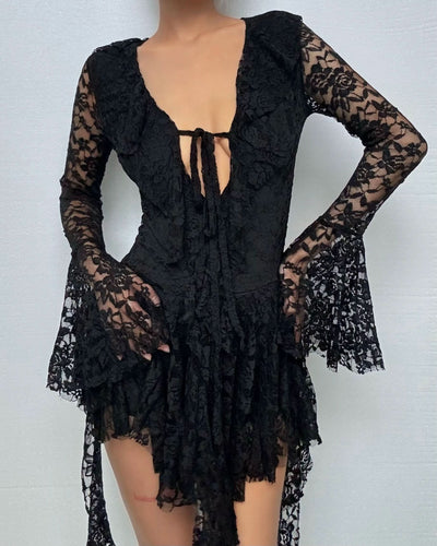 Long flared sleeve lace self tie mini dress