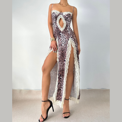 Leopard print lace hem hollow out high slit cami cut out maxi dress