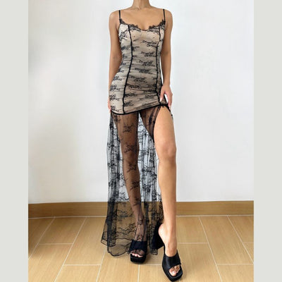 Zip-up slit button lace chiffon cami maxi dress