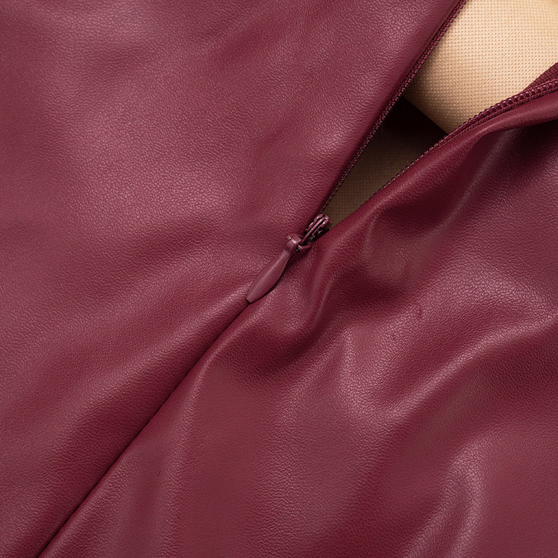 Halter self tie ruched PU leather zip-up mini dress