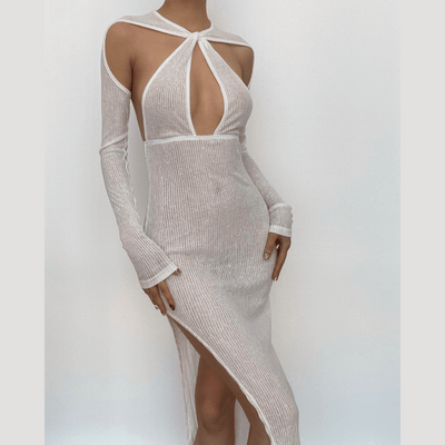 Long sleeve contrast irregular high neck ruched mini dress
