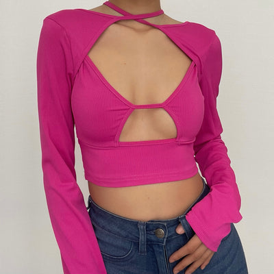 Sleeveless high neck hollow out solid gloves crop cut out top