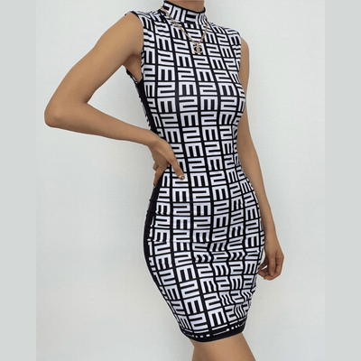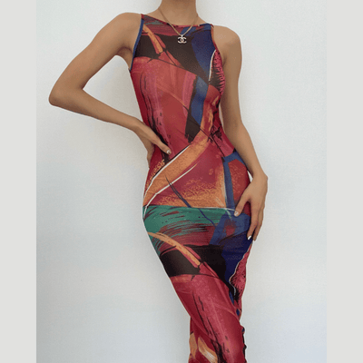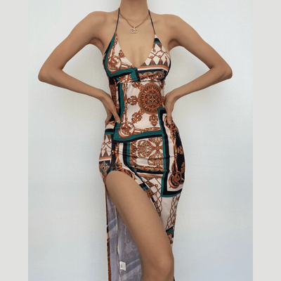 Contrast print v neck backless sleeveless midi dress