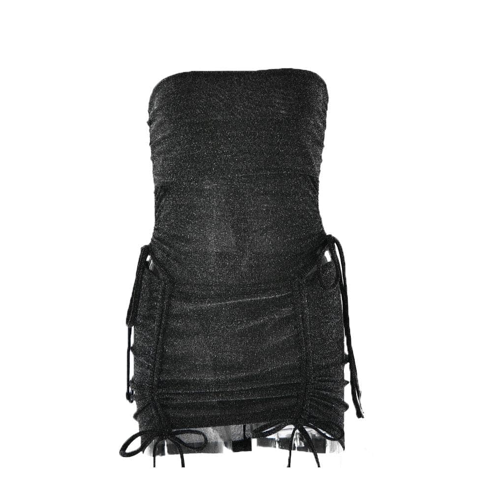 Drawstring textured backless solid bodysuit mini skirt set