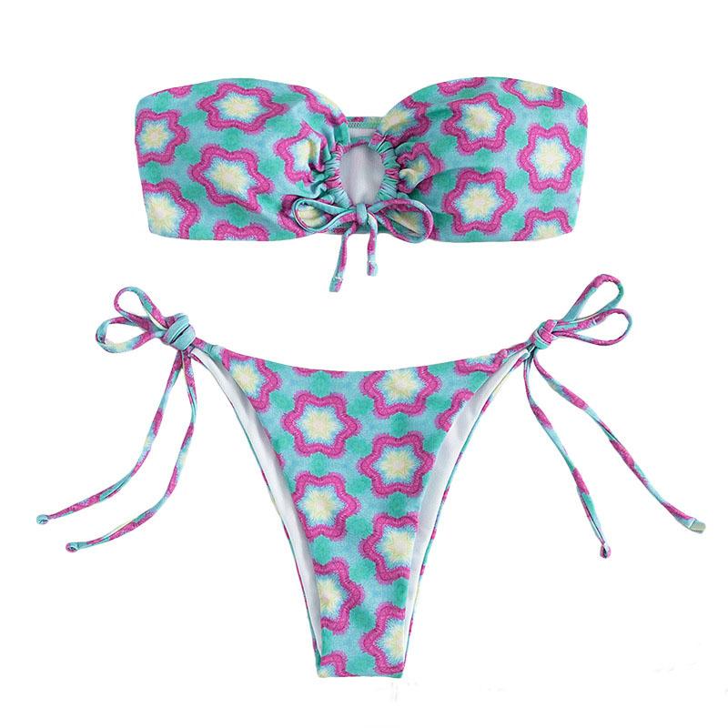 Contrast o ring flower pattern self tie padded tube bikini swimwear
