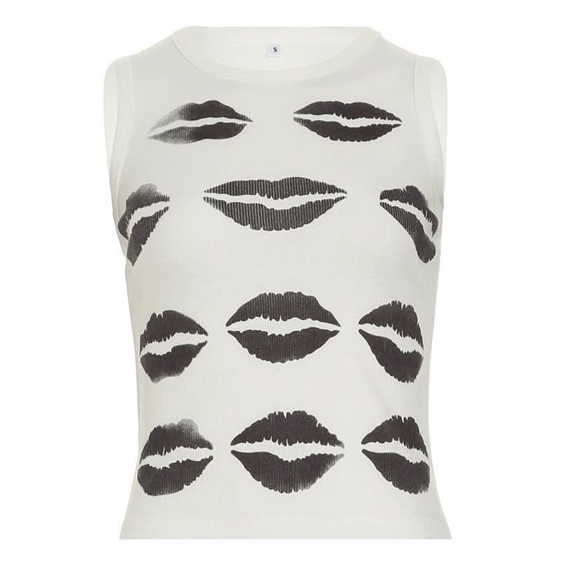 Crewneck ribbed lips print contrast crop top
