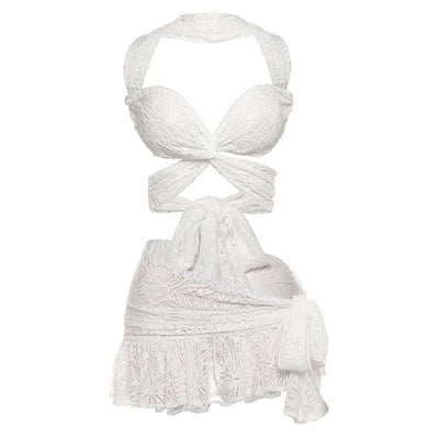 Ruffle long flared sleeve lace flower applique mini skirt set