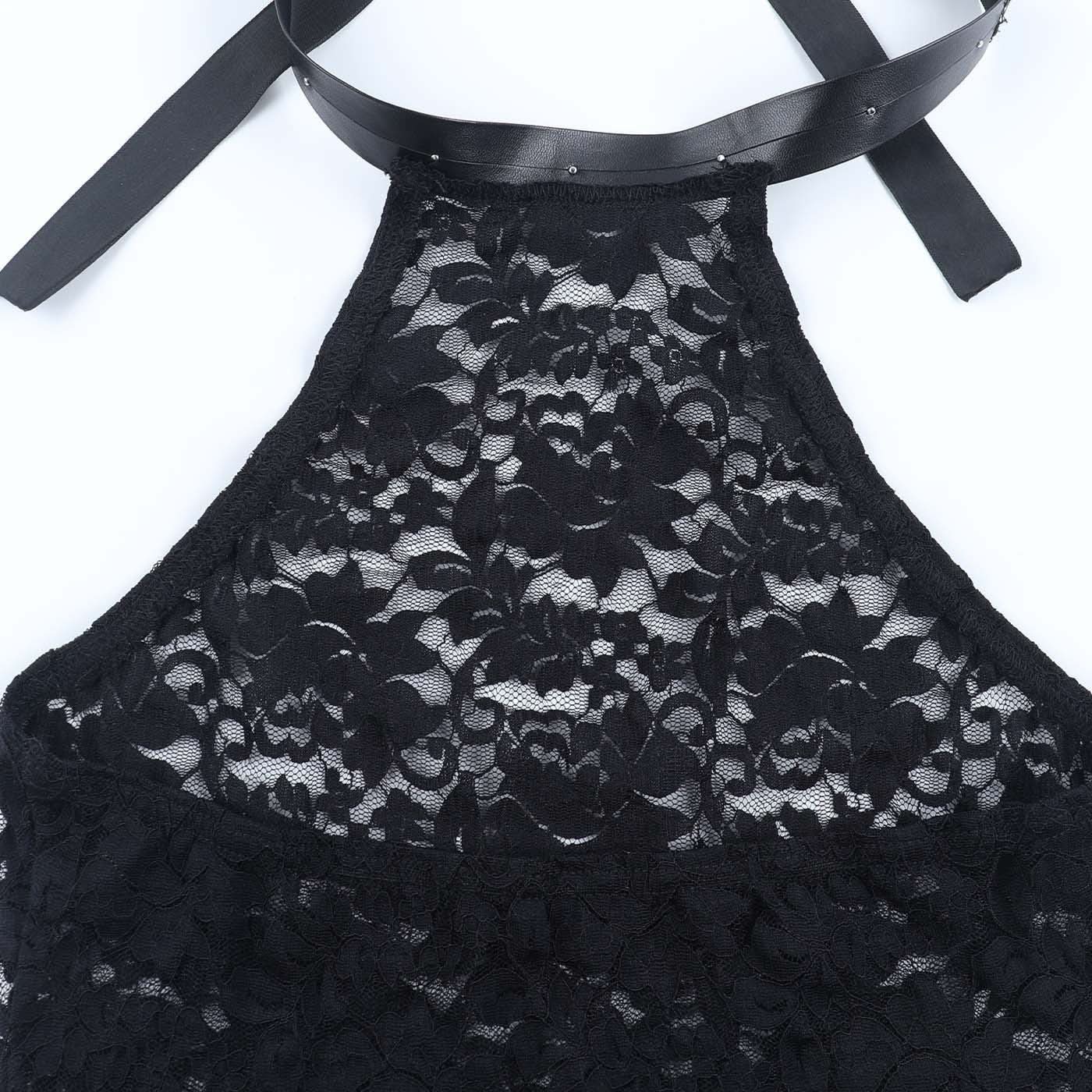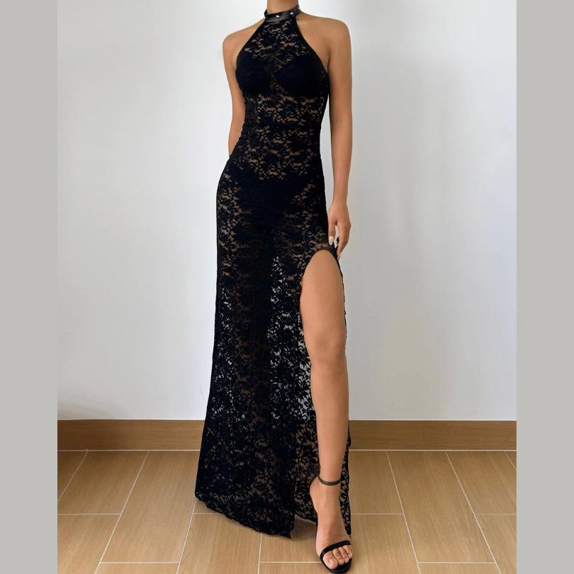 Halter self tie slit see through lace maxi dress