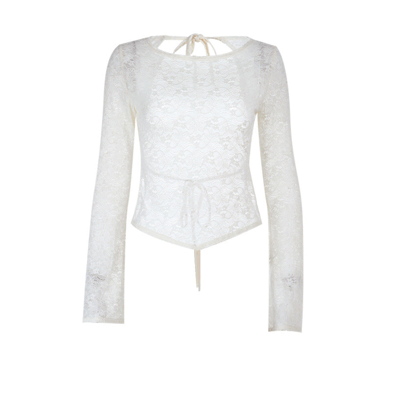 Long sleeve round neck self tie backless lace top | Festival Outfits Women